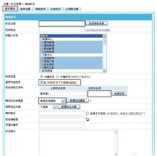 必填项:栏目名、栏目存放文件夹、绑定的系统模型、所属列表模板(模板选项TAB)、所属内容模板(模板选项TAB)