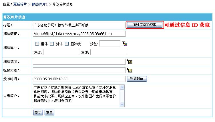 | 3、点击“静态碎片1”的“[更新碎片]”,进入碎片的信息管理: | ||||||||||||||||||||||||||||