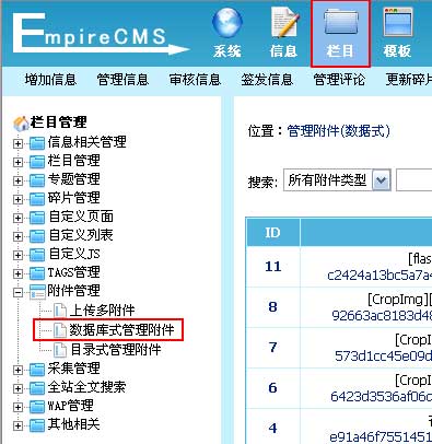 1、登录后台,单击"栏目"菜单,选择"数据库式管理附件"子菜单,进入数据库式管理附件界面: