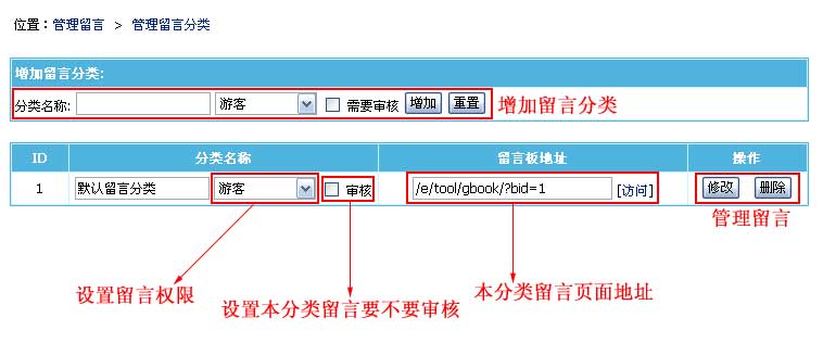 2. 修改留言分类:在已增加的留言分类中,修改分类名称、允许留言的最低会员组级别及留言是否需要审核,单击“修改”按钮。 3. 删除留言分类:单击操作选项“删除”按钮,删除所在行的留言分类。 4. 访问留言版地址:在留言分类列表中,每条留言分类所在行均有留言板地址,单击[访问]按钮进行查看。 |