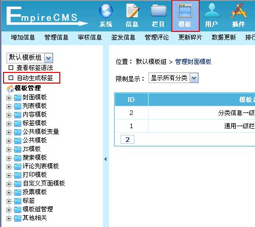 (一)、登录后台,单击“模板”菜单,选择“自动生成标签”子菜单,进入自动生成标签工具界面: