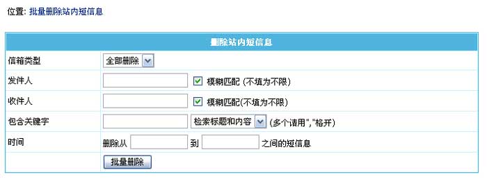 | 一、登录后台,单击“用户”菜单,选择“批量删除短信息”子菜单,进入批量删除短信息界面: |