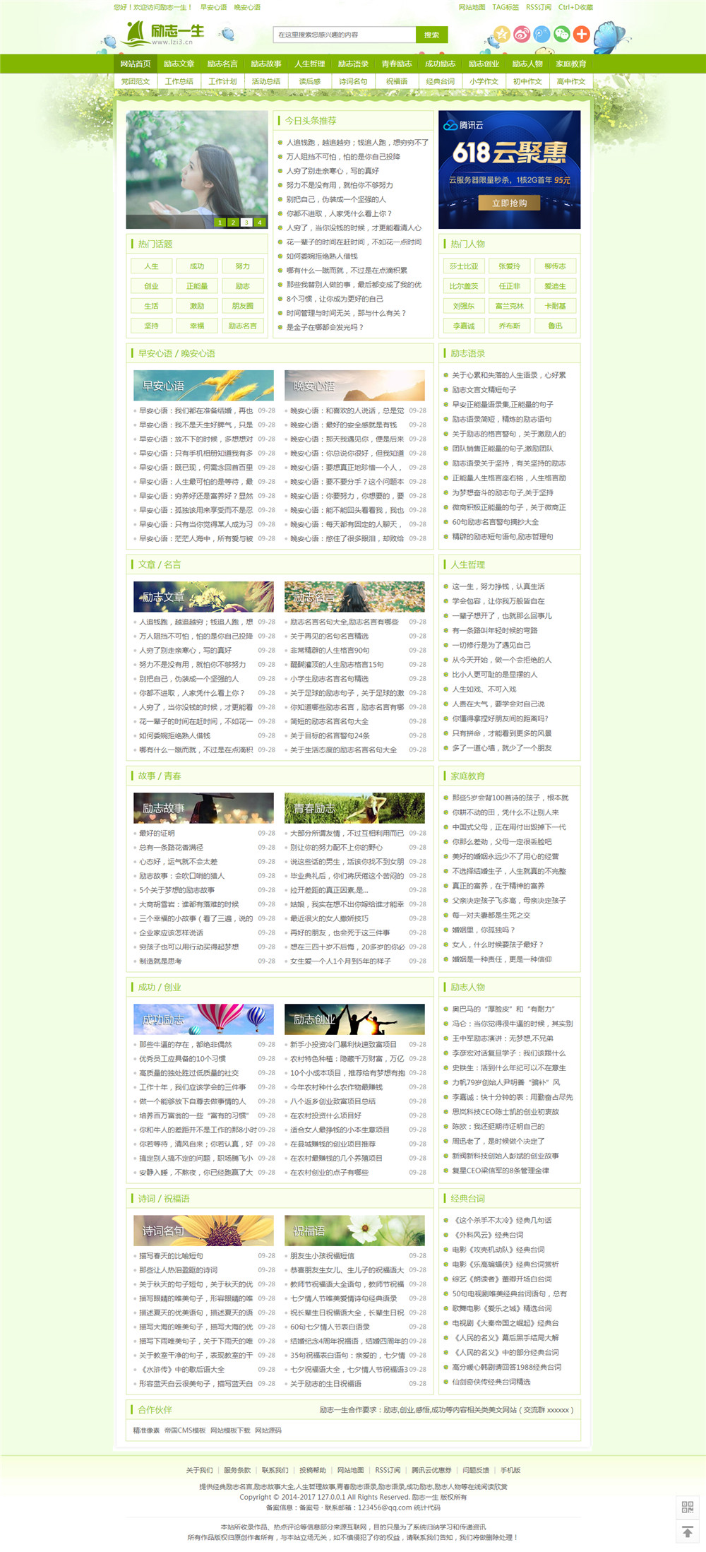 一款绿色风格励志文章网站模板,帝国CMS7.5版本,UTF编码。这款模板应该是帝国CMS美文模板二开而来的,简化了功能模板,只保留了最简单的新闻功能,访问速度非常友好,比之前发布的帝国CMS美文网模板快多了。
